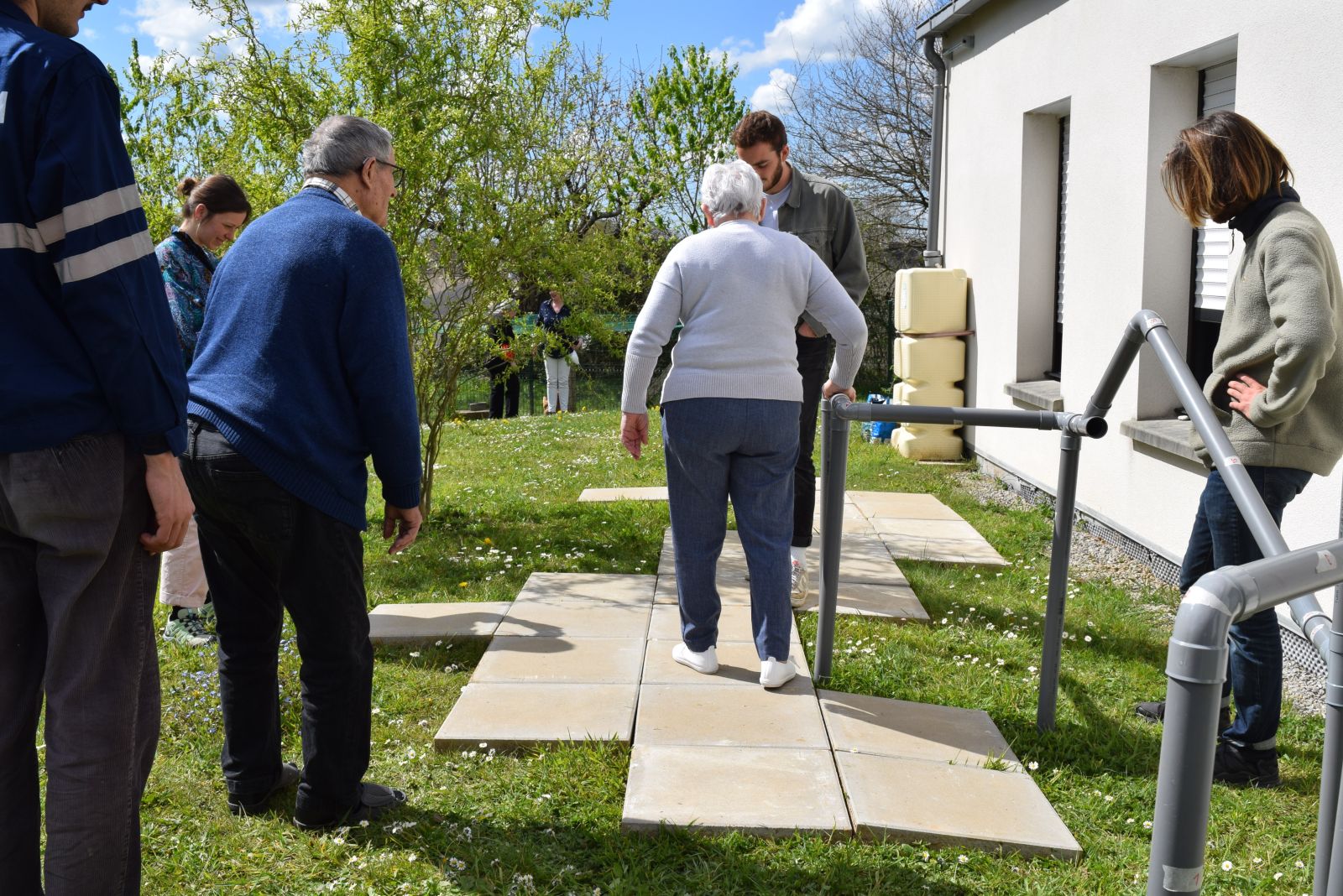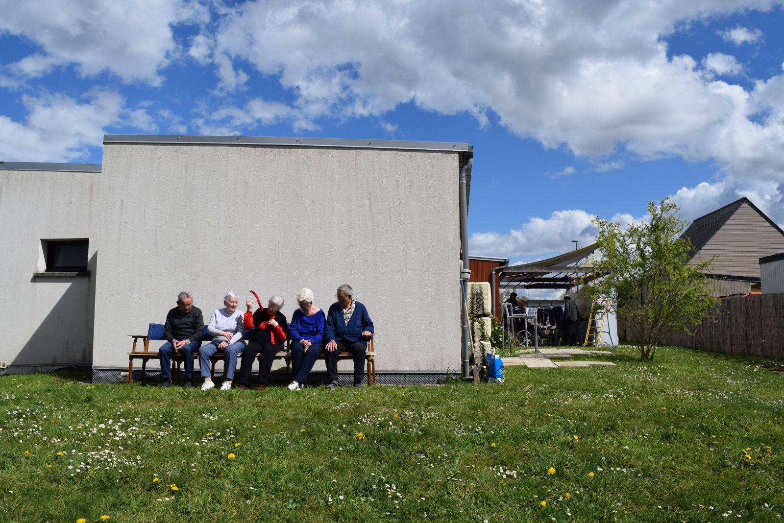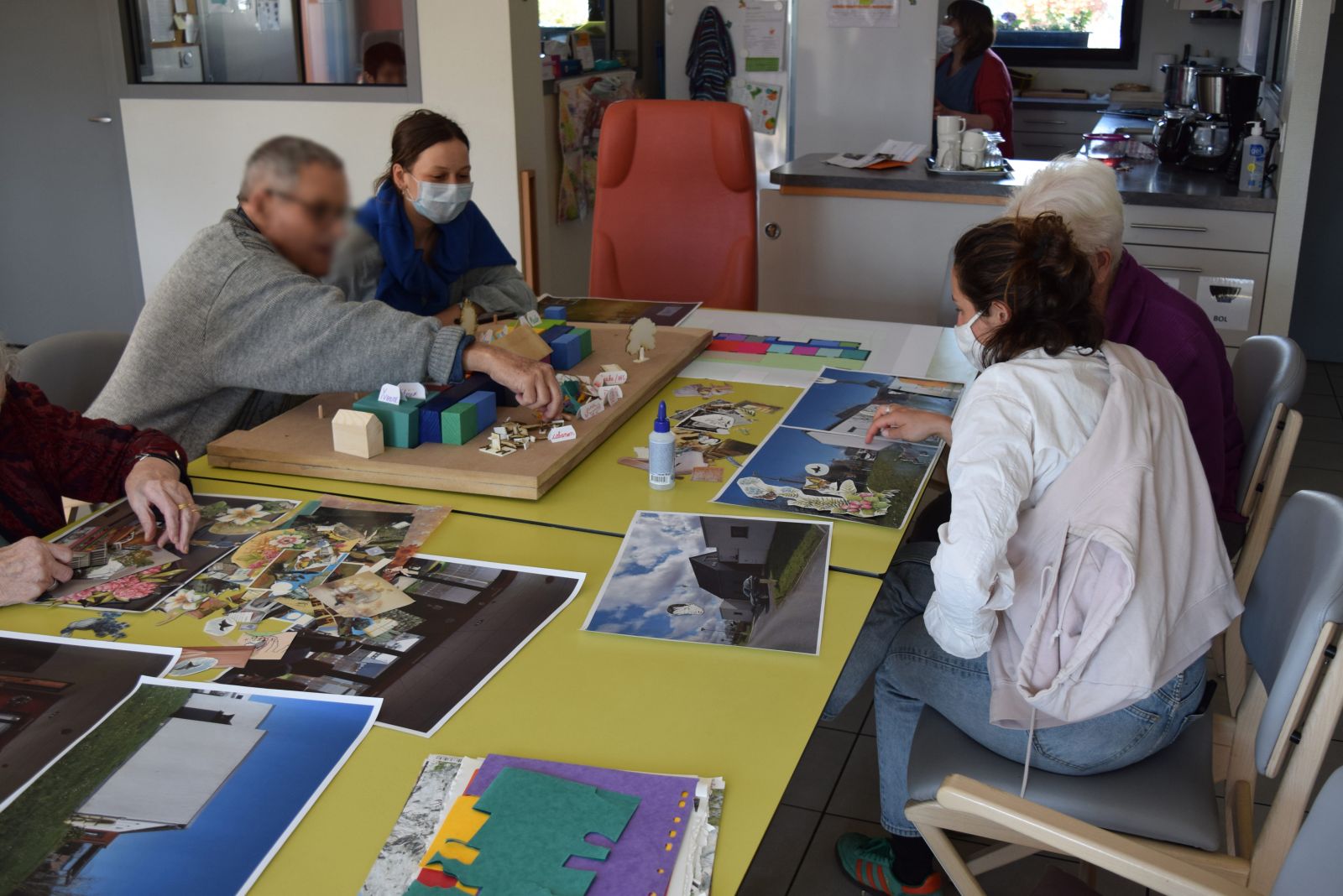 Des ateliers de collage et de maquette nous aident à créer une relation avec les habitant.e.s. Nous testons à échelle 1 des dispositifs, des matières, des couleurs. Les matériaux anciens et nobles viennent contraster avec l’univers médical du domicile. La plantation du pommier du souvenir est le prétexte pour organiser un goûter au fond du jardin, tester des pavages au sol, des rambardes d’appui, faire s’asseoir les habitant.e.s sur un grand banc en matériaux de réemploi… Des échanges de lettres annoncent nos venues au domicile avec à chaque fois de nouvelles choses à tester sur place. Peu à peu, nous constituons un nouveau langage et dessinons des constructions adaptées à ces personnes.