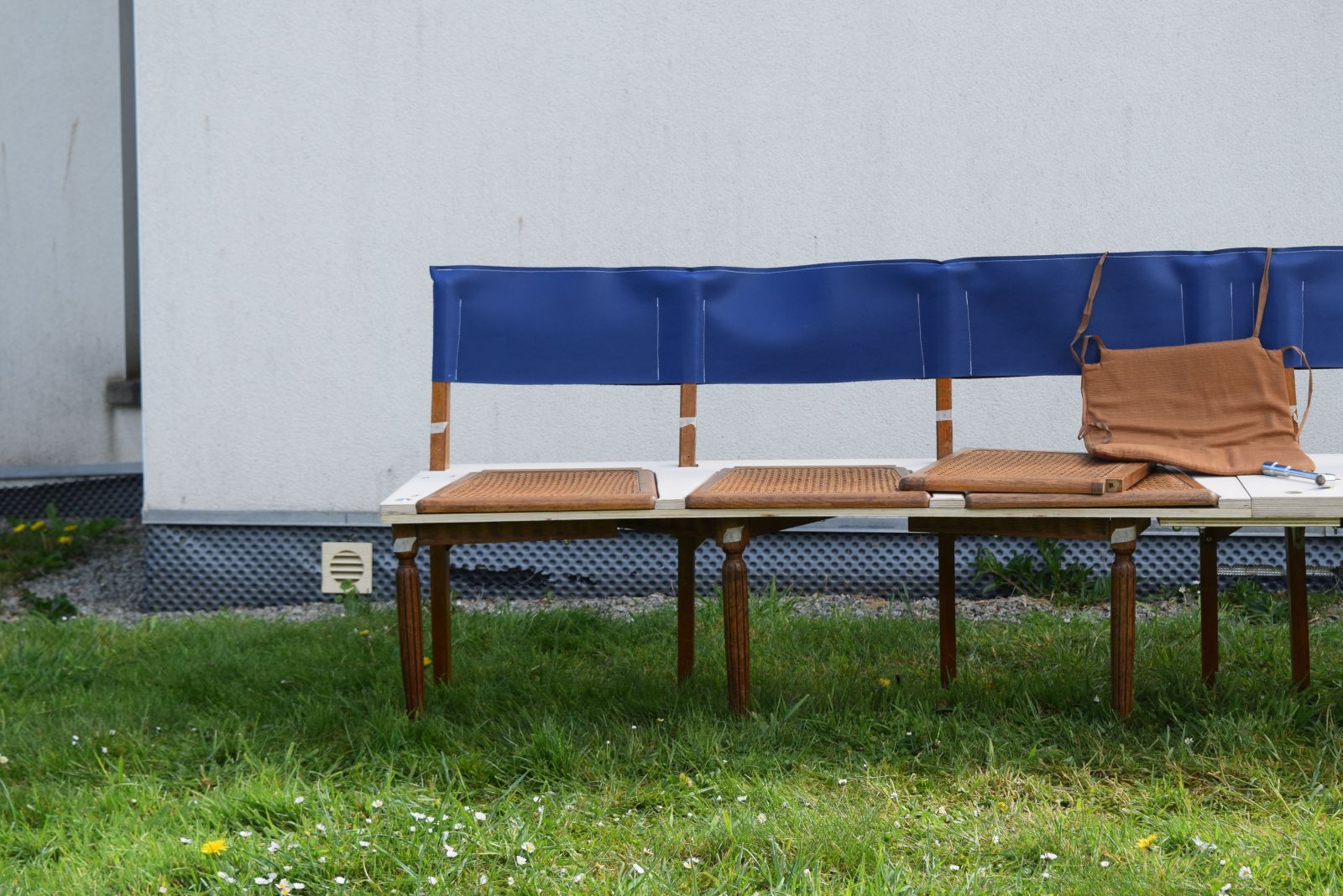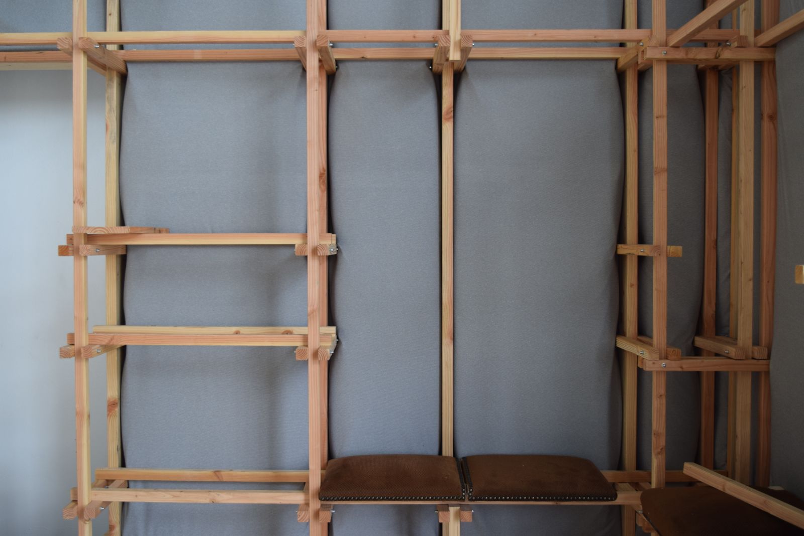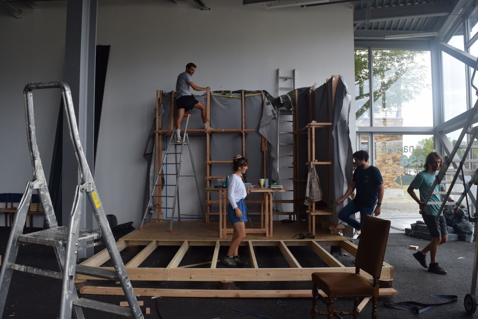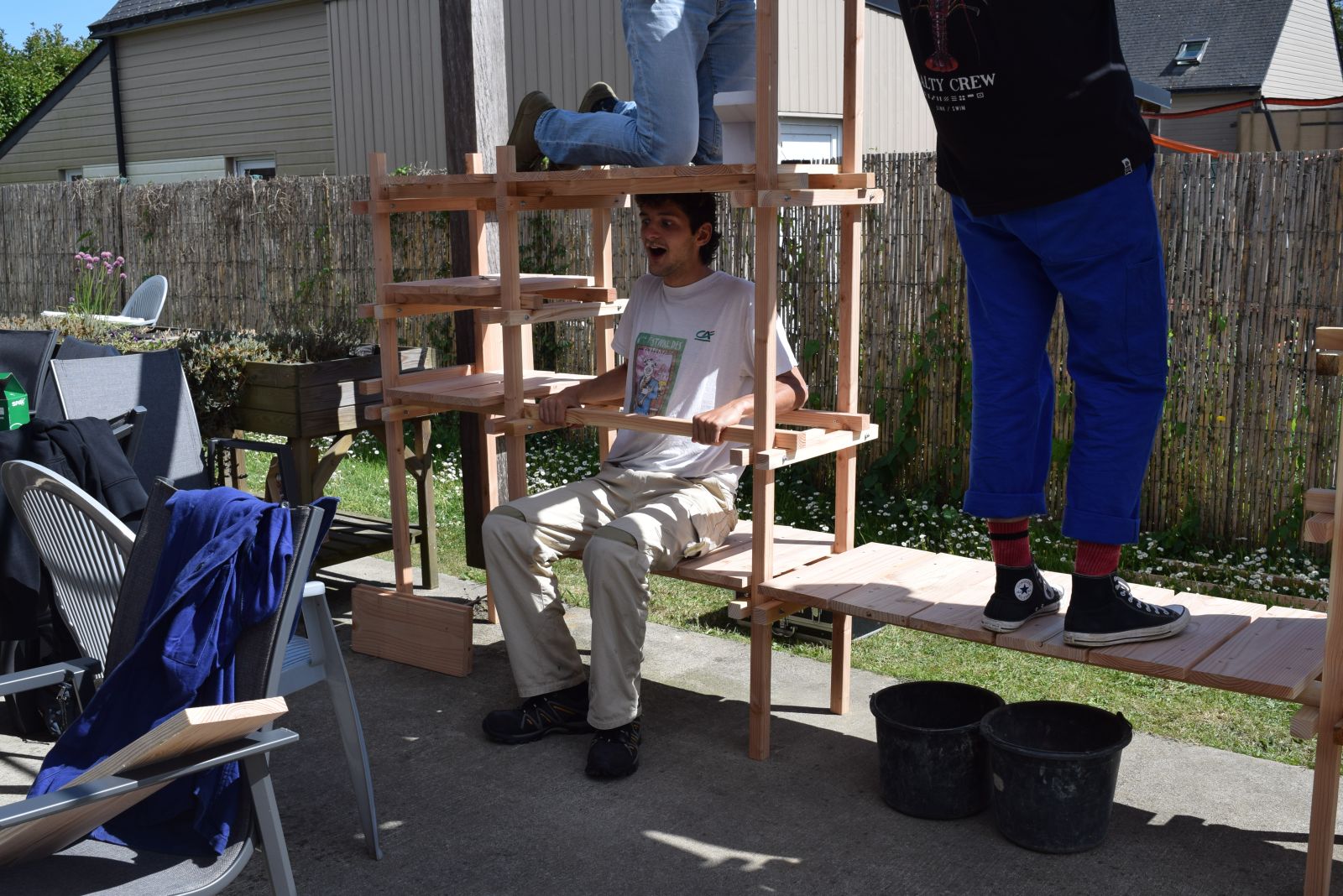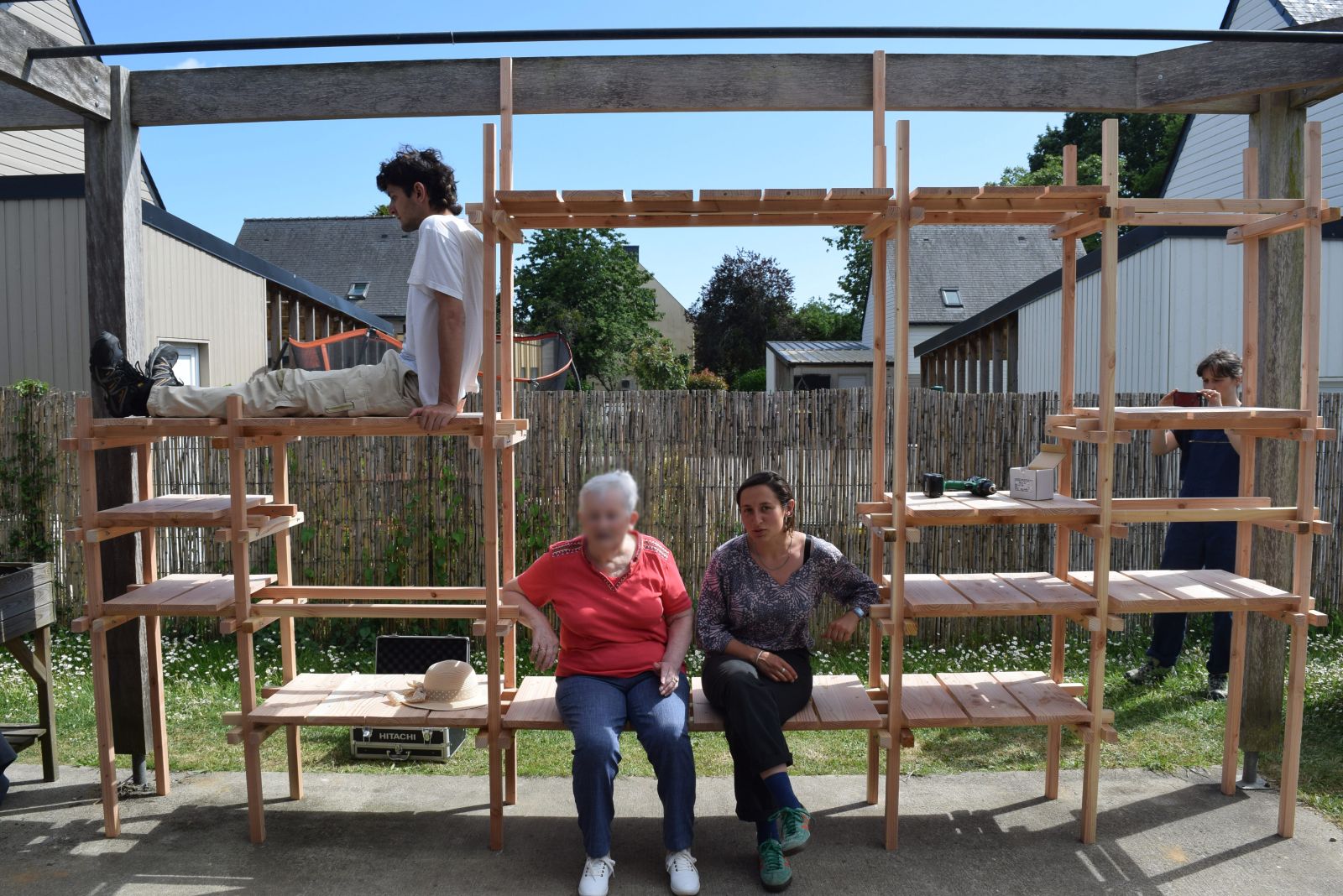 Un budget de 15 000 euros est alloué aux matériaux (fourni par le Clarpa56 et BSH, futurs propriétaires du prototype construit). Nous gérons les commandes de matériaux, une scierie locale fournit le bois. Nous construisons sur place de nouveaux mobiliers à l’extérieur, et au sein de l’école, le prototype de l’extension grandit petit à petit. Nous utilisons des matières nobles, des morceaux d’anciens meubles, du textile… Les stimulations sensorielles aideraient à ralentir la maladie d’Alzheimer. Nous souhaitons apporter au domicile partagé un nouveau dictionnaire de matières.