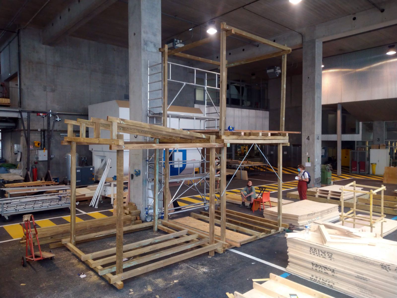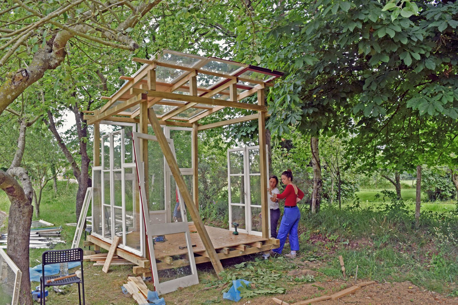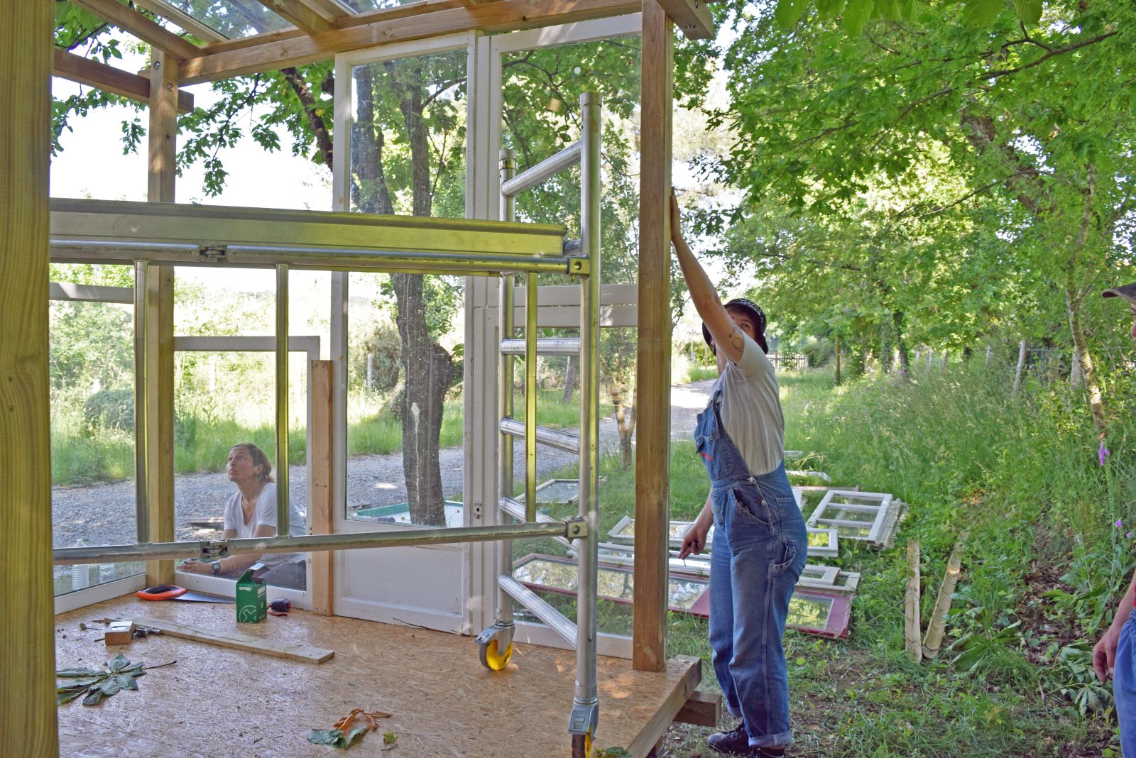 En parallèle du montage de cette structure, nous prévoyons tout le second oeuvre en réemploi et mobilisons un large réseau : articonnex pour le cp, une entreprise de menuiseries nous donne des pelletées de fenêtres, nous récupérons des bennes de palettes pour effectuer nos planchers, du filet etc…