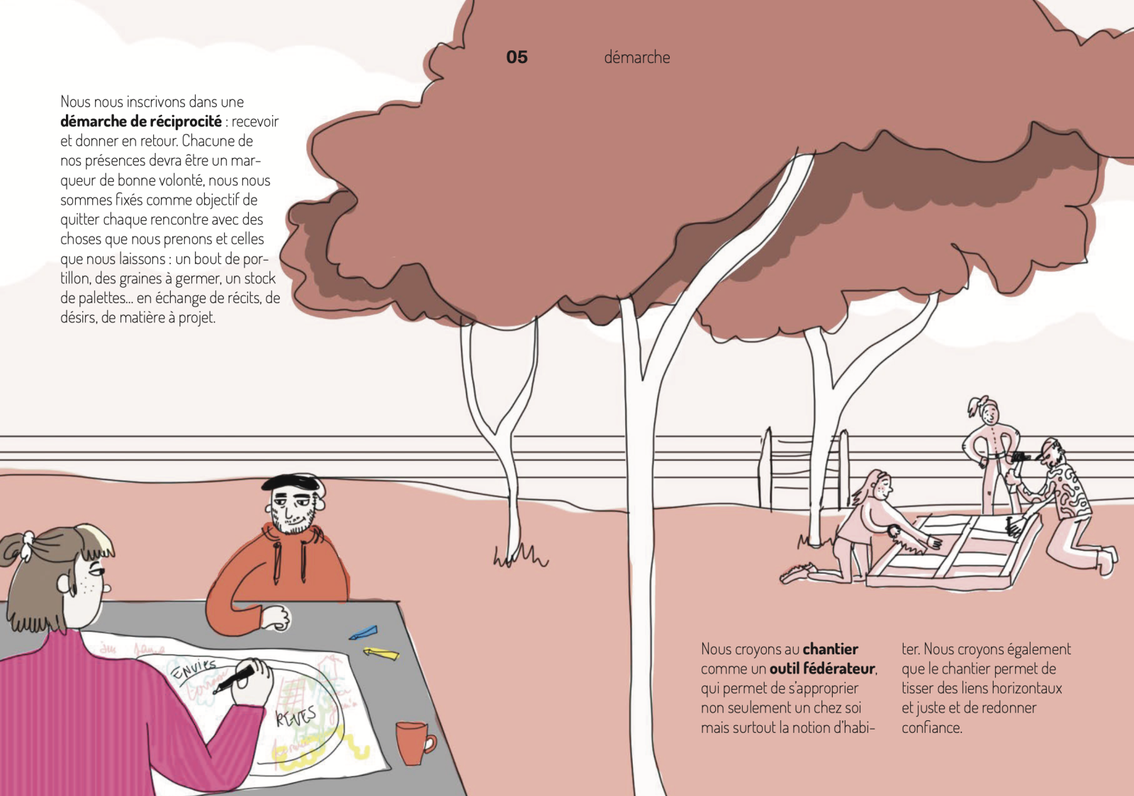 Afin de construire le projet « avec » les habitants, nous sentons que nous devons établir un lien de confiance sur le temps long et nous décidons vite de revenir chaque semaine, un voire deux jours, pour 4 ou 5 heures chaque fois. Nous ne sommes donc pas là en permanence comme le suppose cette méthode, mais régulièrement et nous réalisons que nos absences comptent autant que les présences.
